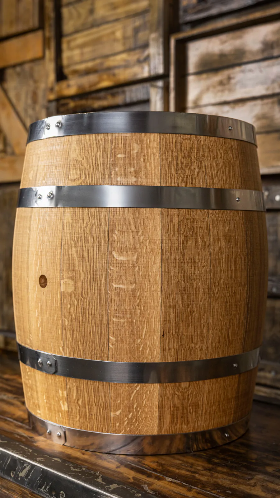 Crafted from European oak, each barrel is fire-charred on the inside to enrich aroma, colour, and complexity during maturation. The exterior is treated with natural linseed oil for protection and long life. Stainless steel hoops ensure structural strength over time.